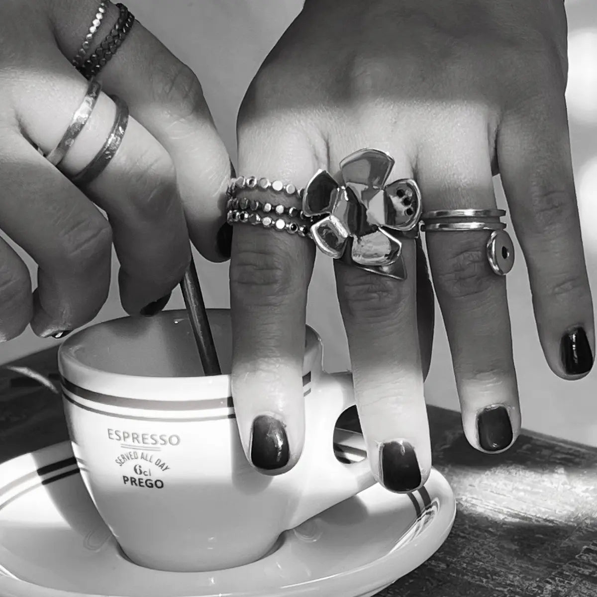 Cette bague, en Argent 925 et pierres fines de spinelle noire, arbore un design délicat qui sublime chaque main avec finesse et éclat.